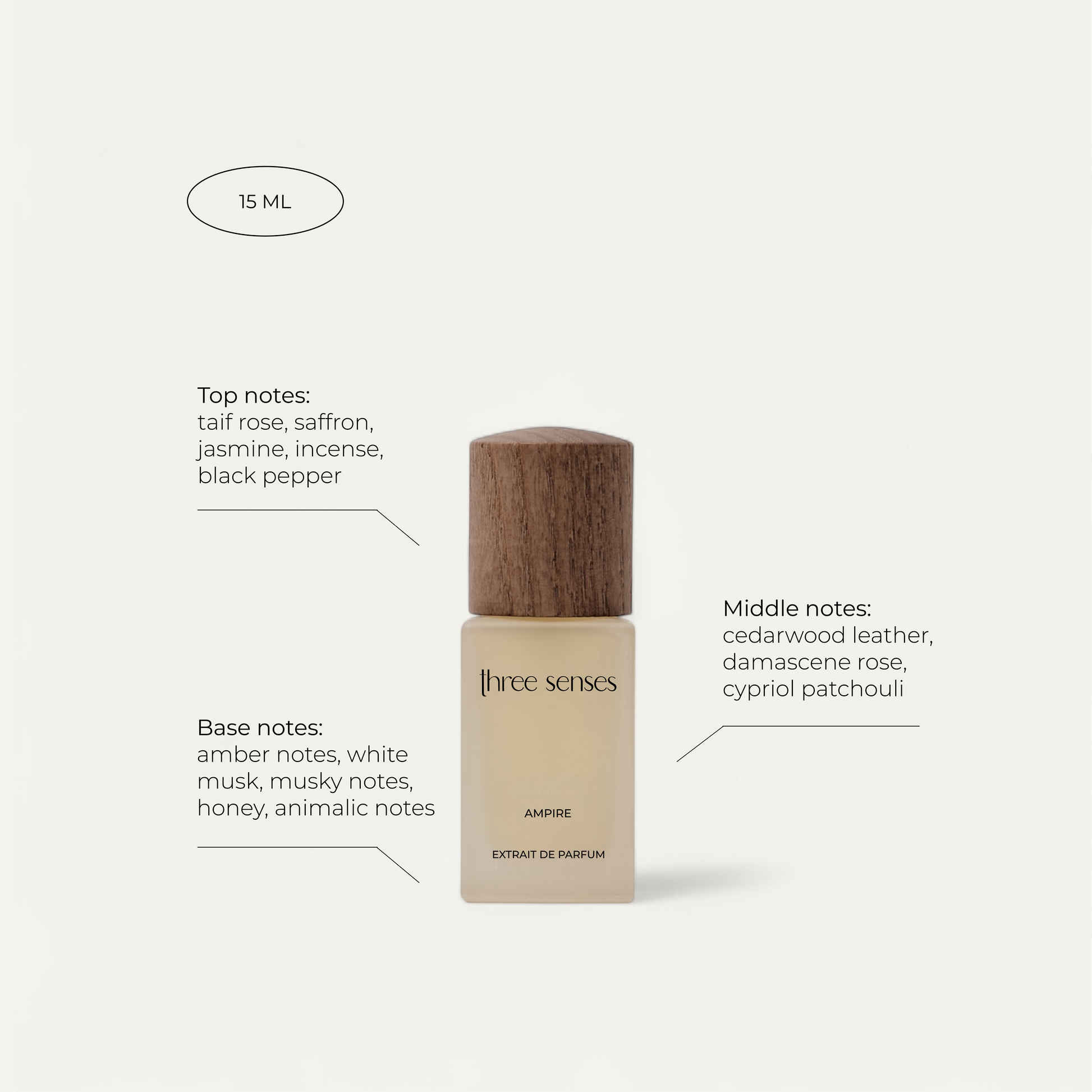 "أمباير" هو عطر امبراطوري بلمسة من العنبر، و هو صدى العطر على البشرة والفضاء، لمسة ورديّة، وضبابية، لا تنسى.