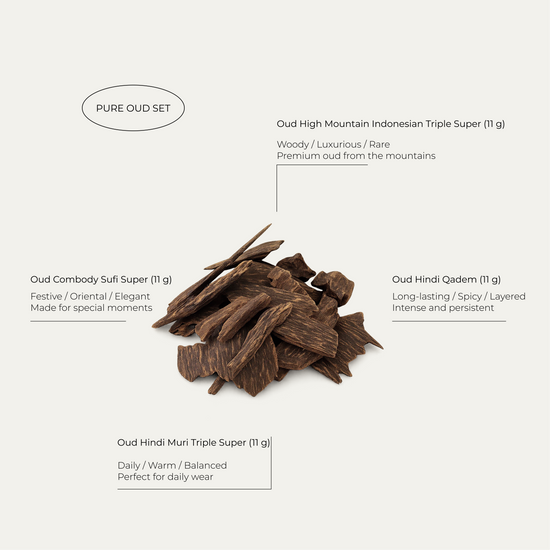 يضمّ هذا الطقم المختار بعناية أربعة من أفخر أنواع العود لدينا، حيث تم اختيار كل منها بناءً على نقائها وعمقها وطابعها المميز.