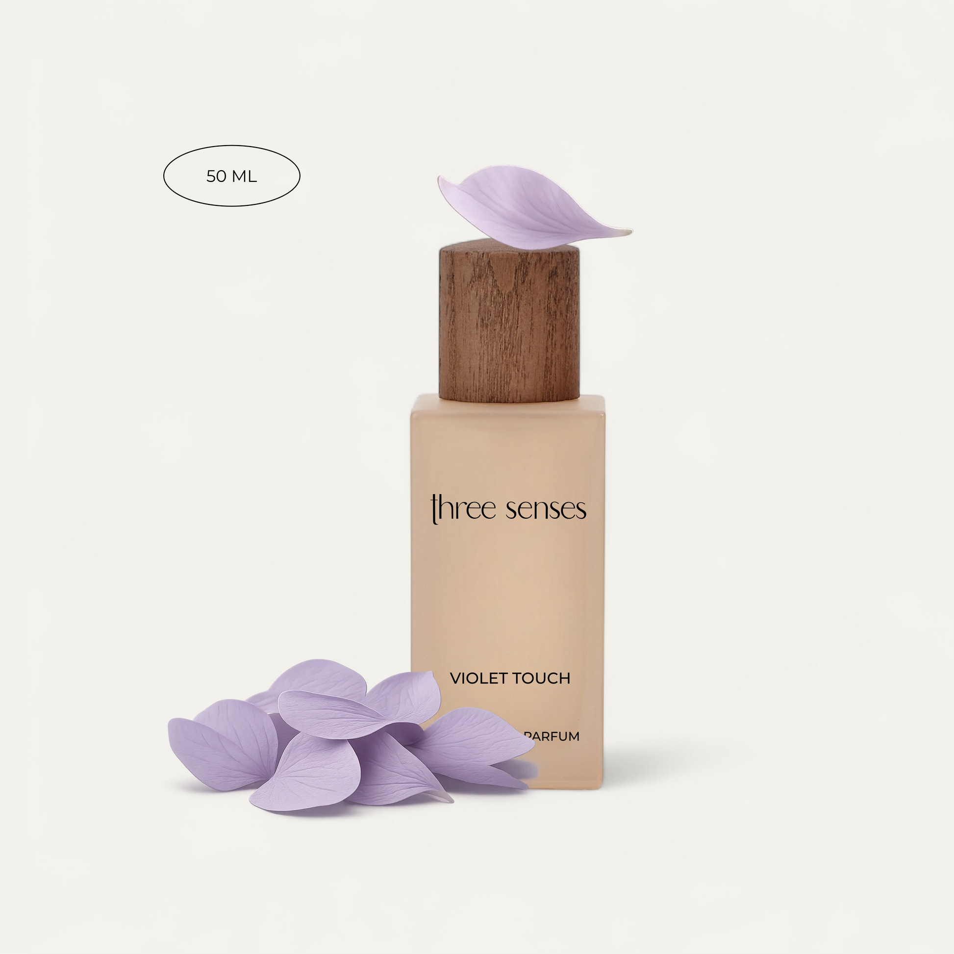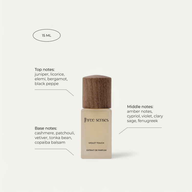 Violet Touch is a scent shaped by clarity and quiet strength—where freshness meets earth, and light moves gently through shadow. Inspired by the stillness of early morning, it opens with juniper, bergamot, and the dry spice of black pepper—cool, crisp, and intentional. As the scent unfolds, violet and amber bring softness, while cypriol and sage recall dry wind over stone and herbal warmth.